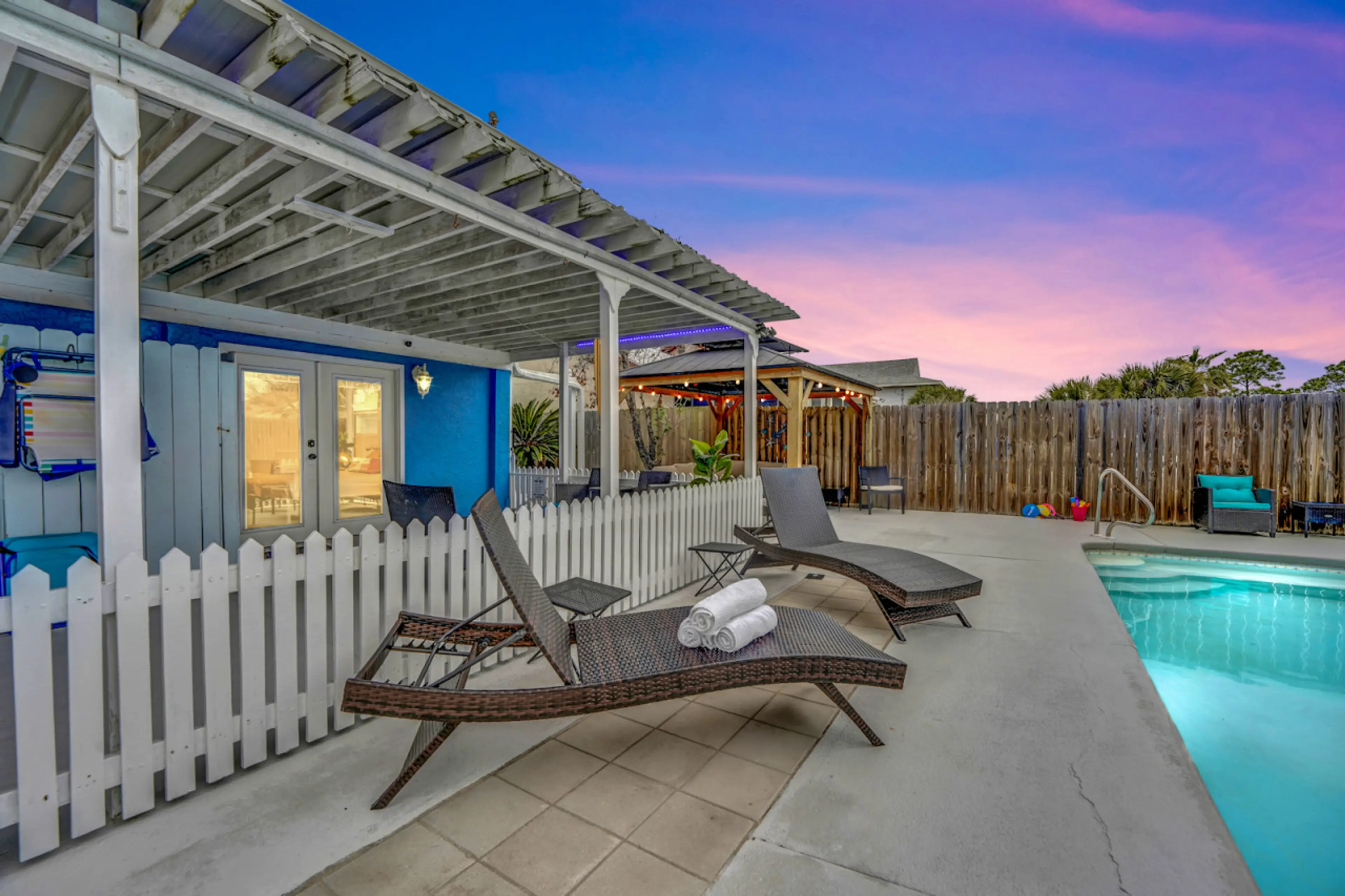 This property has 3 bedrooms and 2 bathrooms. As a highly sought after Panama City Beach home, we boast a NEWLY REFINISHED private salt water pool and gazebo with lounge seating all around. We're pet friendly too! There is a NEW wrap around deck that has a grill, seating, and peek-a-boo views of the...